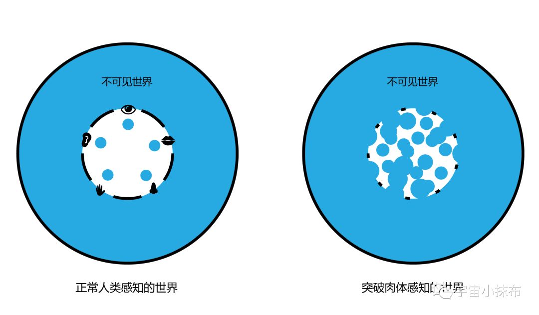我相信更多的人对这个阶段感兴趣,我展开说一下。突破肉体局限,刚开始会表现为五感(视,听,味,触,嗅)的消失,比如感受不到身体,或者声音消失,有些人甚至会感受到呼吸停止了。根据不同人突破的程度,会不同程度的感觉到自身的延伸或者膨胀,或者也可以理解为不同程度的与世界合一。下面给大家一个图示就非常好理解了,正常情况下人类通过五感接受世界信息,输入端口少,感受到的信息就少(只有五个蓝点),当你冥想达到肉体临界边缘的时候,你的输入端口就多起来了。五感的界限被冲淡变的模糊,更多的输入端口被激活,这时候你感受到的世界会更大,甚至某些地方与世界融为一体。