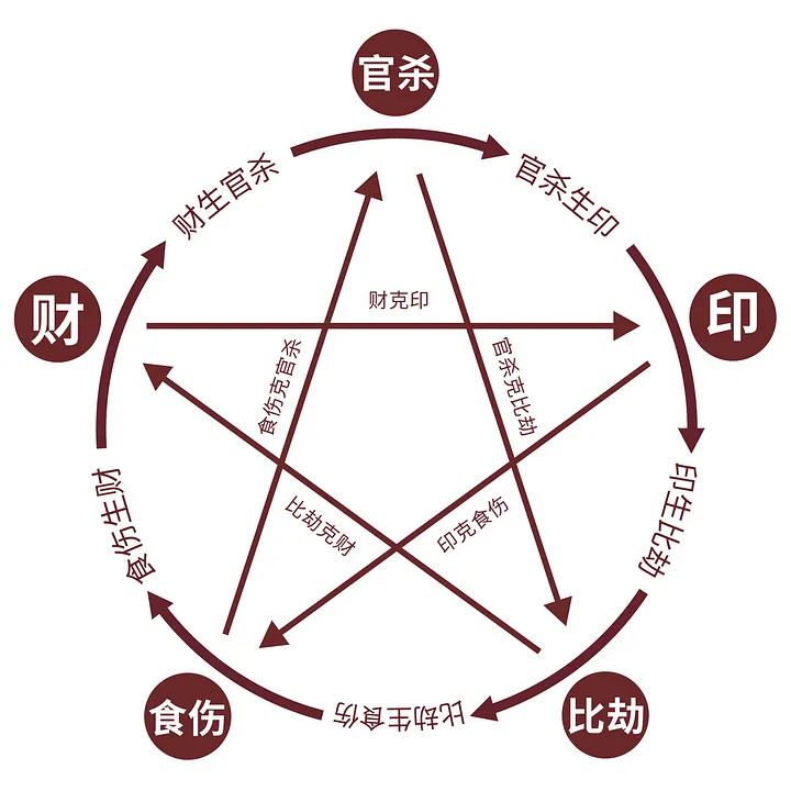 那么今天想给大家分享几点宿命里与我们的六亲相关的财富密码,在八字里十神的相生克基本是基本断格局最最最重要的。这些密码就藏在这张图中: